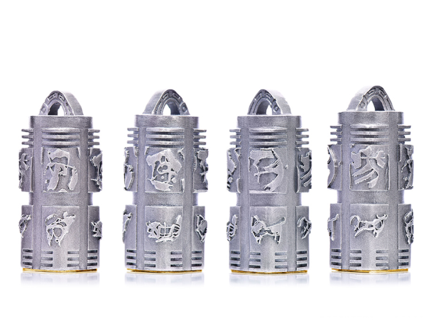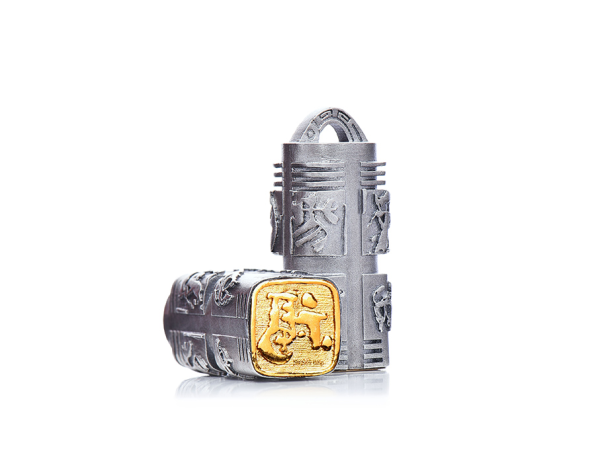 生肖牛乾坤印以中国古文明良渚文化中的祈福玉琮为设计灵感,型款呈圆柱形,印体内圆外方,有融汇天圆地方之意。印身四面分别刻有不同的韩美林生肖牛绘画与天书作品,搭配易象乾与坤,蕴含扭转乾坤的吉祥寓意,顶部印纽采用韩美林鱼元素造型,寓意鱼跃龙门、连年有余。生肖牛乾坤印底部福字印采用0.5克足金材质,成色为足金999,印身及印纽以16克足银打造,成色为足银999。《邮福器》韩美林·生肖牛乾坤印表达了对辛丑牛年乾坤扭转、福运到来、丰收富饶的美好祝福。
