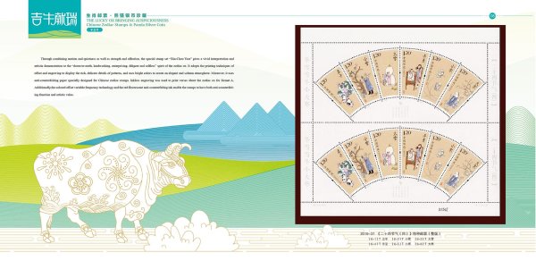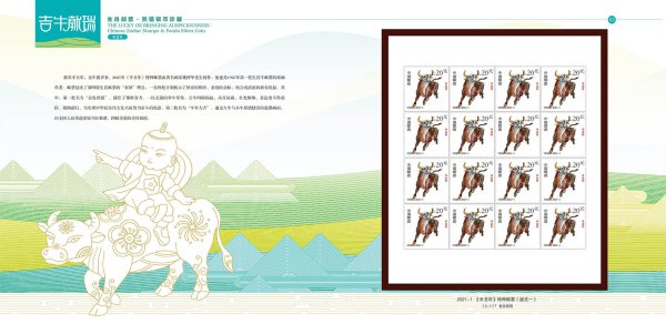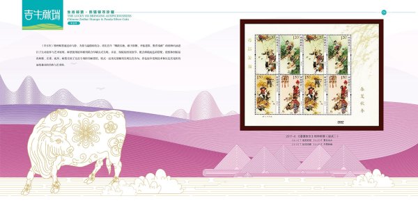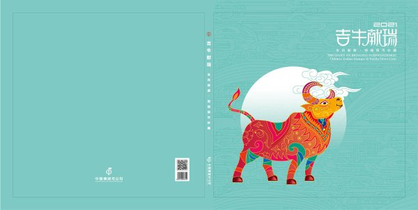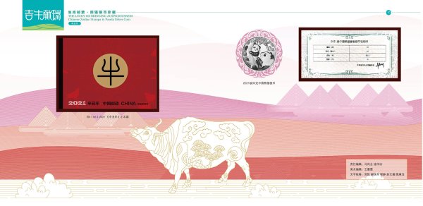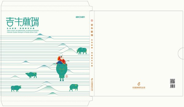 吉牛迎福运,赏春正当时,莫负好时光。手牵吉牛游走山地间,成为此间一道别样的风景。邮册封套选取吉牛与绿水青山元素,通过矢量化的填色手法与线条语言,搭配清新简洁的背景色,将大美河山与游玩之乐展现地淋漓尽致。邮册封面采用插画吉牛与祥云日出元素,表达勤劳的吉牛日出而作,日出东方带来牛运祥和。邮册内页划分五大板块,搭配“熊猫银币”以及“辛丑牛大版票”等,于方寸之间,见证天地之大,感受万物繁盛,吉牛献瑞。