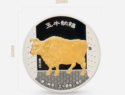 《五牛纳福》银镶金纪念章:克重:足金0.1g×5枚,足银6g×5枚,直径:3cm