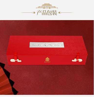 产品外包装以太和殿隔扇门三交六椀菱花图案为灵感,提取棂花元素归纳重组,象征了天地相交、万物生长、国泰民安,盖板正面镶嵌五牛3D立体金属画一副,一体成型,形象逼真;整体采用故宫宫墙红为主色调。