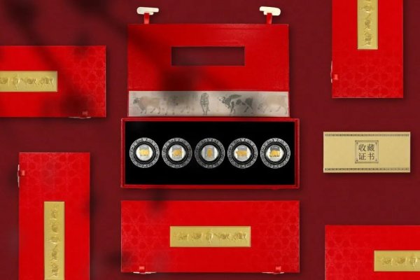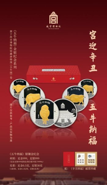 《五牛纳福》银镶金纪念章是以故宫博物院院藏《五牛图》卷为源,由故宫博物院授权开发的金银纪念文化创意产品。收录《五牛纳福》银镶金纪念章5枚,采用Au.999+Ag.999铸造,克重:足金0.1g×5枚,足银6g×5枚;直径:3cm。内含《辛丑年》版式二邮票1套、收藏证书1张)、国检证书1张。