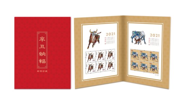 收录2021年《辛丑年》邮票版式二1套。《辛丑年》邮票全套两枚,分别为“奋发图强”和“牛年大吉”。“奋发图强”描绘了雄壮有力、一往无前的奔牛形象。“牛年大吉”通过大牛与小牛舐犊情深的画面,传递家庭兴旺和谐,团圆美满的美好祝愿。