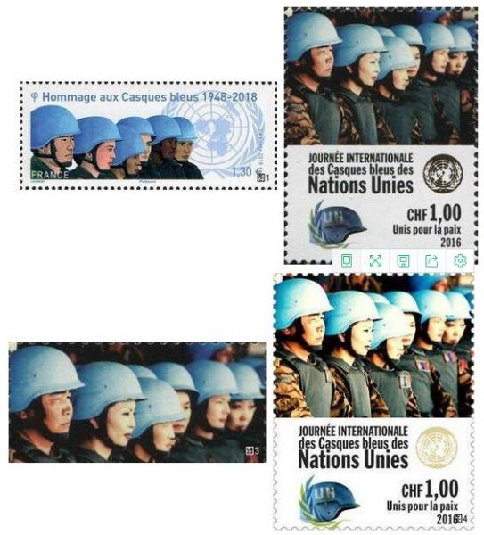 笔者一见到这枚邮票的图案,就觉得其似曾相识。经翻查相关邮票,发现它是依据联合国邮政2016年5月29日发行的1套6枚《国际维和人员日》邮票中的“维和女兵”(图2)所采用的照片重新绘制而成的,并非纯粹的原创作品。笔者将照片裁切成与法国邮票相同的高宽比例(图3),两者对比可以看出,法国邮票设计者完全复制了原照片中人物的朝向、姿态、高矮和排列顺序,只是将原来的亚洲裔人士和女兵改绘成不同肤色的男兵(仅保留了一位女兵)。法国邮政介绍这枚新邮的官方资料中只标明其设计者为玛蒂尔德·洛朗(Mathilde Laurent),但并未注明其所依据照片的出处或向照片版权人鸣谢,似有抄袭之嫌。