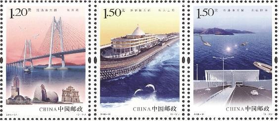 “青州桥”一图为仰视角度构图,实景主体为身披东方晨曦的港珠澳大桥以非凡的气势横空出世,由于香港会展中心、珠海大剧院、澳门大三巴牌坊三地地标性建筑作为前景被同步缩小后置入,便成为邮票背景了。邮票的画外音正是:金秋十月,伶仃洋上海天一色,潮声阵阵,依傍着这片中国南海水域的城市群迎来深具意义的美好时刻。“东人工岛”一图以俯视角度表现,画面主体实景的东人工岛在灿烂的阳光下坚如磐石地展现于蔚蓝色的大海上,画面右下方两只自由嬉戏的中华白海豚以弱化的表现方式成为此枚邮票的背景。此情此景通过艺术语言说明:跨海大桥穿越广东珠江口,这片海域有很多白海豚,建桥前后基本没有差别,人们仍然可以来这里拍白海豚跃出海面,表明港珠澳大桥是“生态桥”。“海底隧道”一图则以平视角度表现,主体实景展现了海底沉管隧道的入口,宛如直入深海“龙宫”的要塞,是那样的壮观,虚幻的背景显示的是港珠澳大桥整体建筑工程全景,画面处处都在为邮票的点题设下“伏笔”。港珠澳大桥的建设创下多项世界之最,体现了一个国家“逢山开路、遇水架桥”的奋斗精神,体现了国家的综合国力与自主创新能力,体现了勇创世界一流的民族志气。