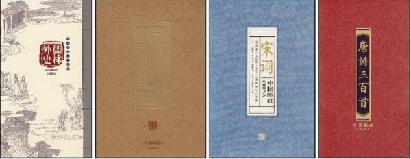 色彩绚丽之“美”。除了8套邮票上的五彩缤纷,8款邮票风琴折也采用了不同的色彩,《唐诗三百首》风琴折以棕红色为底,辅以金黄纹饰;《中国古典文学名著——〈儒林外史〉》风琴折以米黄色为底,辅以浅紫图案,右侧深灰阔边装饰;《宋词》风琴折以海蓝色为底,辅以花卉纹饰;《元曲》风琴折以深绿色为底,辅以花卉纹饰;《诗经》风琴折以棕黄色为底,辅以花卉纹饰;《中国古典文学名著——〈西游记〉(一)》风琴折以橙黄色为底,辅以棕红色图案;《中国古典文学名著——〈西游记〉(二)》风琴折以米白色为底,辅以棕黄色图案;《钱塘江大潮》以浅灰色为底,辅以棕黄色水波纹图案。它们或古色古香,或现代明亮,其色彩绚丽多姿,令人赏心悦目。