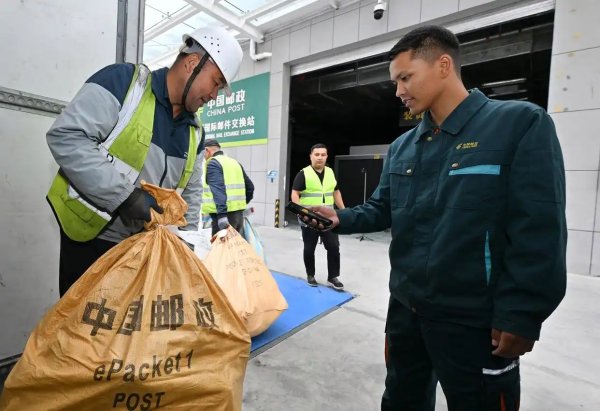 在新疆霍尔果斯国际邮件交换站,中国邮政工作人员(右一)在为即将交换到哈萨克斯坦邮政的邮包扫码转运。据了解,霍尔果斯国际邮件交换站于2022年7月正式运营,以进出口物流渠道为支持,为跨境电商产业链上下游提供仓储和快递物流综合解决方案。承运中国至中亚多国、俄罗斯以及欧洲国家的出口国际邮件。3年来,累计国际邮件交换量2026吨(9月11日摄)。新华社记者 李贺 摄