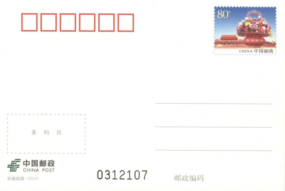 中国邮政定于2019年7月1日发行《祝福祖国》普通邮资明信片1套1枚。详情如下: