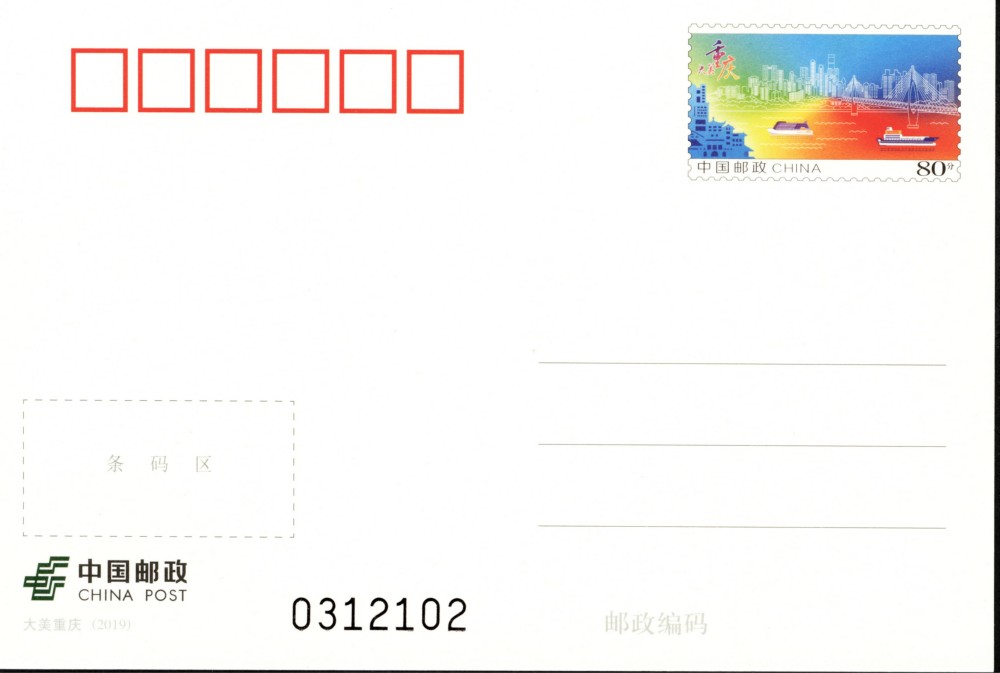 中国邮政定于2019年10月16日发行《大美重庆》普通邮资明信片2枚。详情如下: