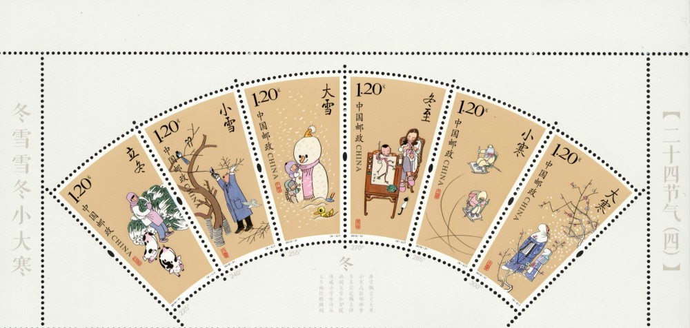 二十四节气是我国古代根据一年中太阳在天球黄道圆上位置划分出来的24个具有时节意义的位置与日期,每个节气约15天,是中国人认知天象、物候、时令和大自然变化规律的知识体系与社会实践,是中华民族传统文化的重要组成部分。2016年,二十四节气被列入联合国教科文组织人类非物质文化遗产代表作名录。本套邮票为自2015年开始发行的《二十四节气》系列邮票第四组,表现冬天的六个节气。经过了春天的草长莺飞、桃红柳绿,夏天的阳光灿烂、浓荫匝地,秋天的金风送爽、硕果累累,便迎来了飞雪凝霜、寒风刺骨的冬天。这六个节气分别是:立冬、小雪、大雪、冬至、小寒、大寒。