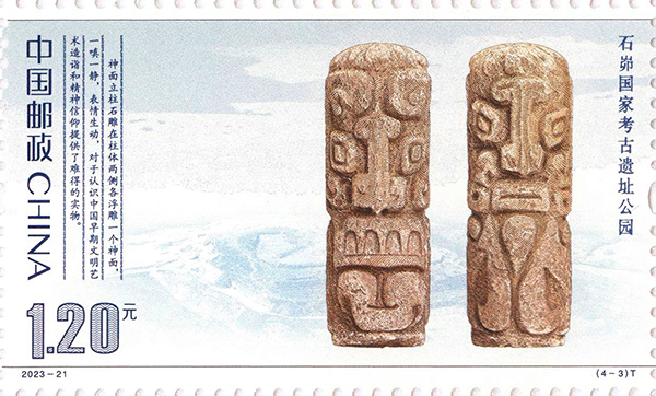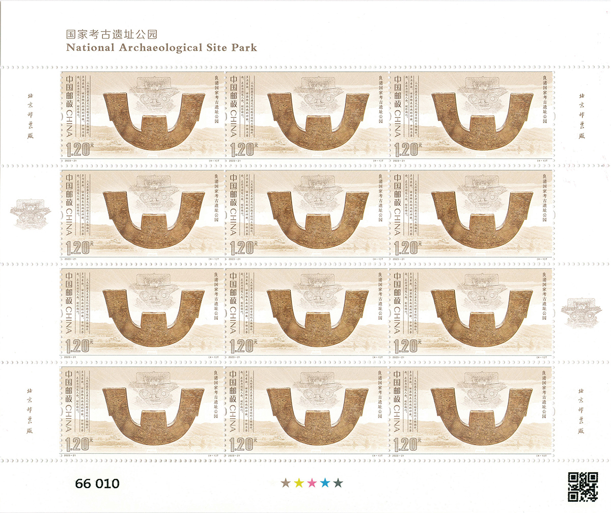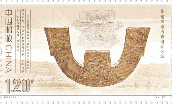此套邮票以“中华文明探源”为主题。其中,良渚国家考古遗址公园位于浙江省杭州市,遗址距今约5300-4300年,具有三重城址和庞大水利工程系统,是实证中华五千年文明史的圣地。选取文物为三叉形器,该器是良渚文化时期首领的头饰插件,多为素面,器物表面施刻神徽,中部为兽面,左右为羽冠人面,形制规整、纹饰精美,体现了良渚早中期玉三叉形器制作的极高工艺水准。